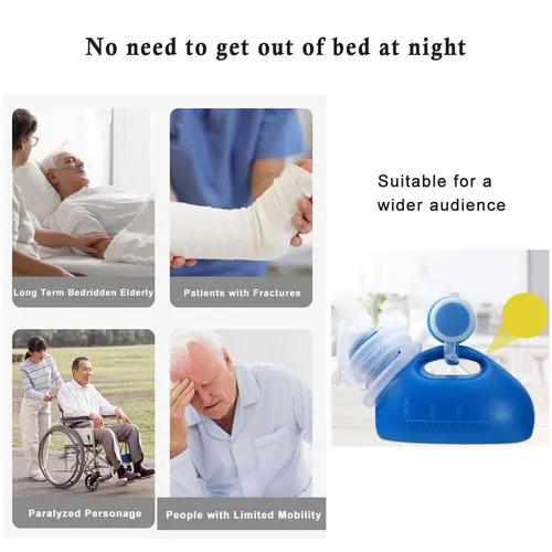 The urine bottle has strong sealing performance, and its unique design makes it completely splash proof and leak proof. It can even be placed on the bed, allowing users to use it immediately. Suitable for men without self-care ability, as well as for traveling or any time without a restroom.